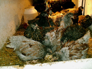The real excitement is the Twenty 10 and 12 week old BLRW chicks. Mate Blue laced and Splash laced together and you get Blues and Splashes. There is 9 Splash and 11 Blues. The youngsters being 2 weeks apart in age and having rose combs, I am still not positive who is a roo and who is a pullet! But I am watching them and guessing.